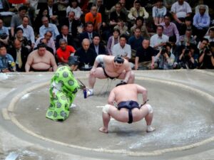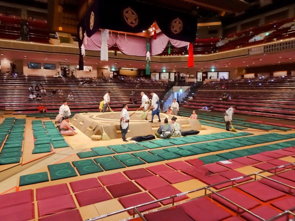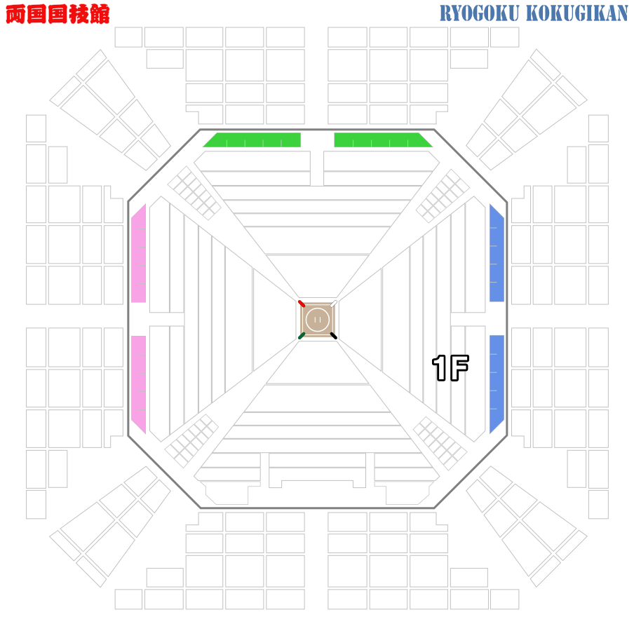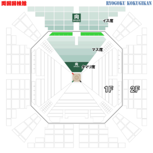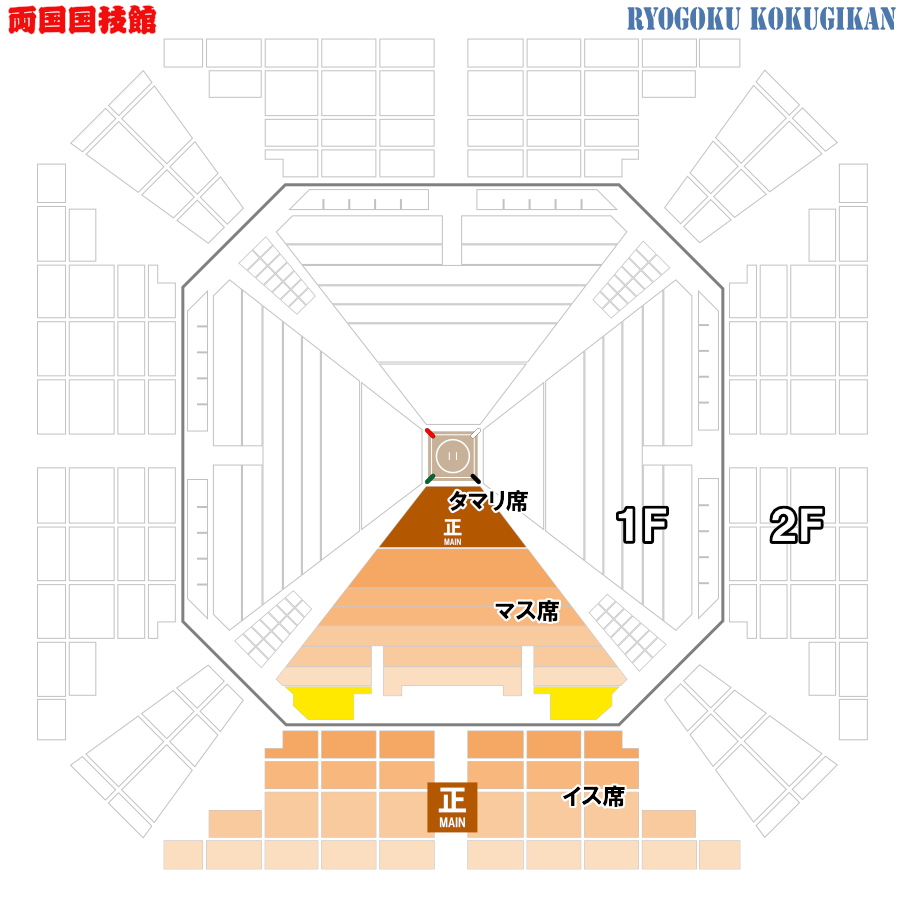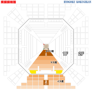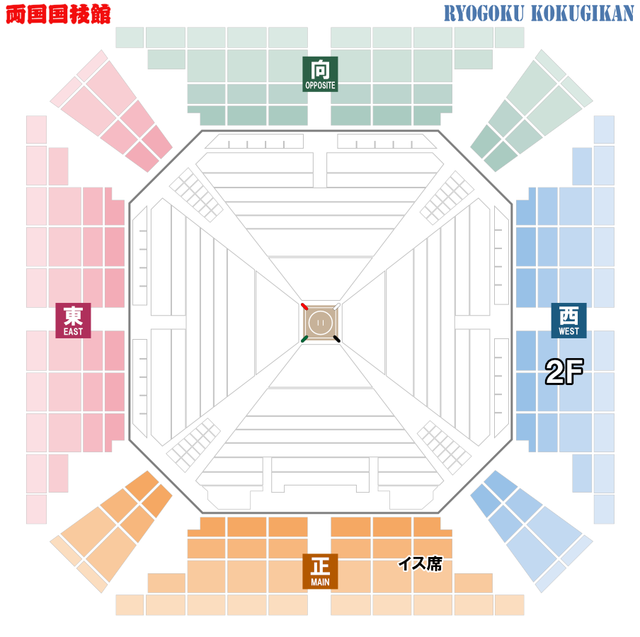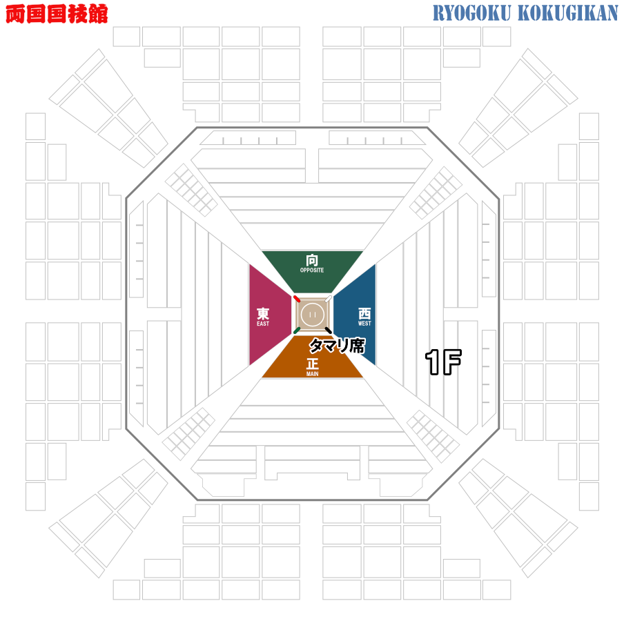 土俵を中心に座席は正面、向正面、東側、西側の4つの方向があります。それぞれの角度によって見え方は違いますが、チケットは正面が人気で向正面がついで