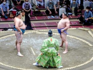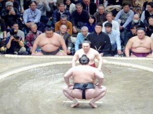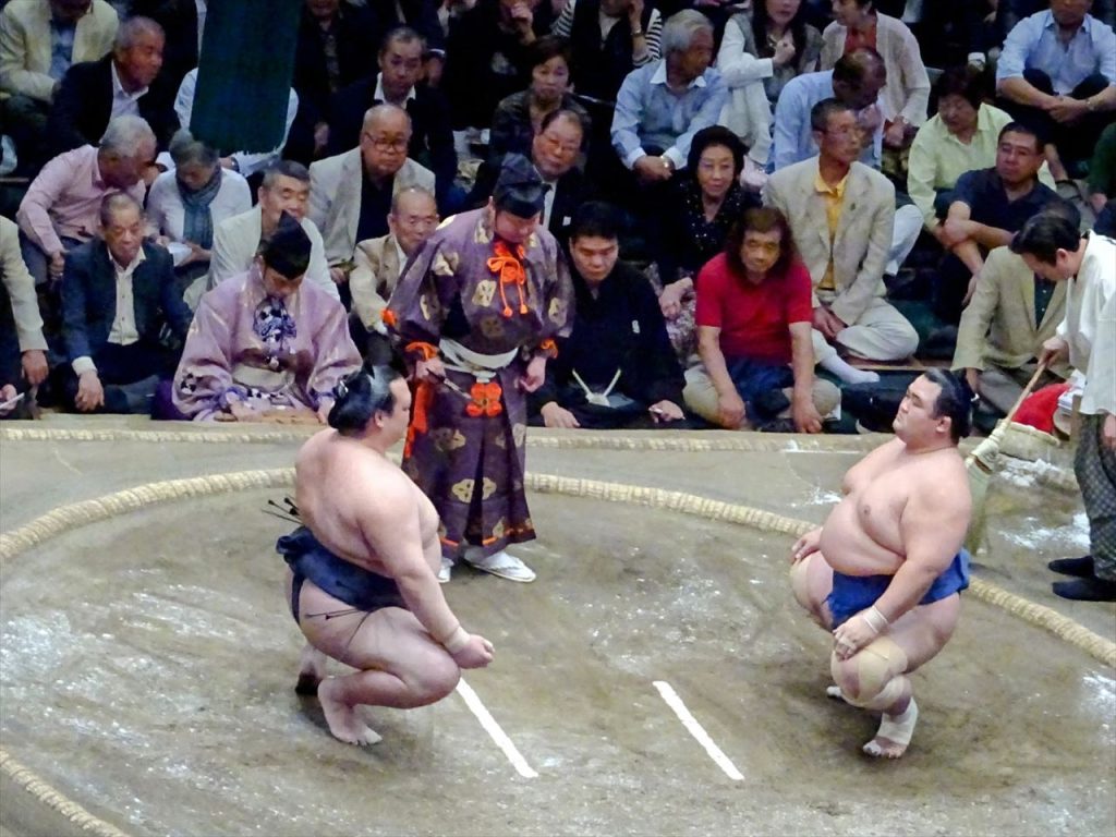 行司が後ろ向きに見えるテレビ中継の角度になります
